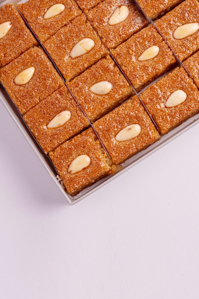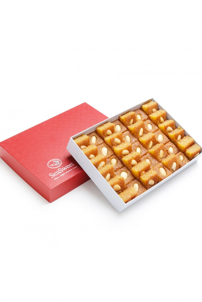 A gift box weighing around 900g of Nammoura. Ingredients: Sugar syrup, semolina, sugar, milk, coconut, animal ghee, tahina, almond, yeast, starch, sodium bicarbonate