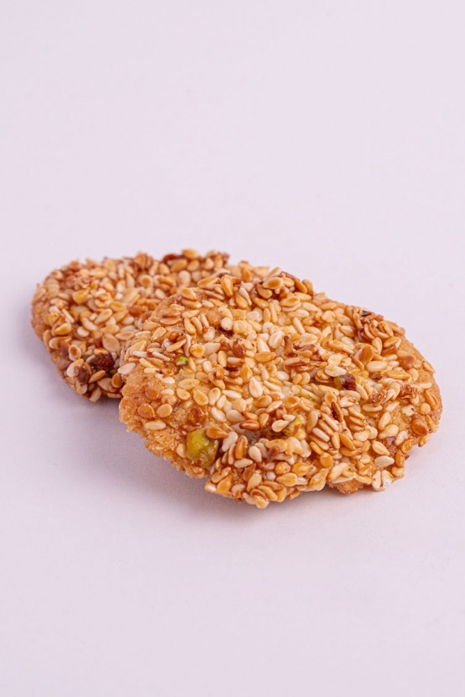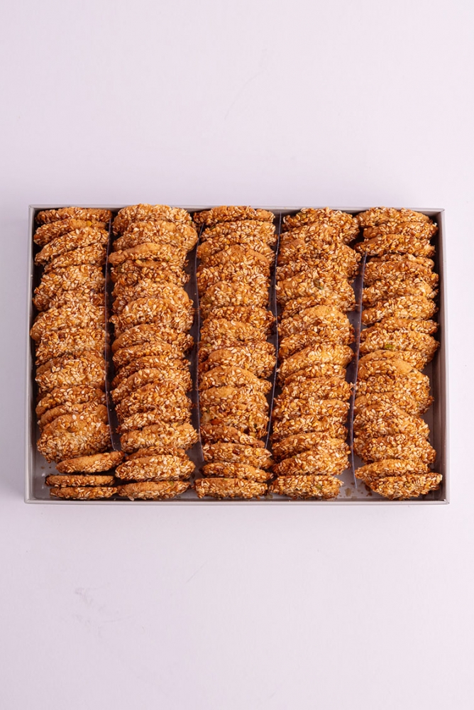 A tin box weighing around 950g of Baraze. Ingredients: Wheat flour paste, with butter ghee, eggs, baking powder, vanilla covered with sesame seeds