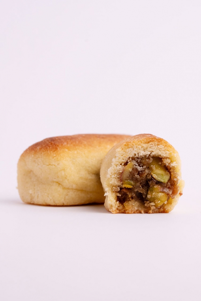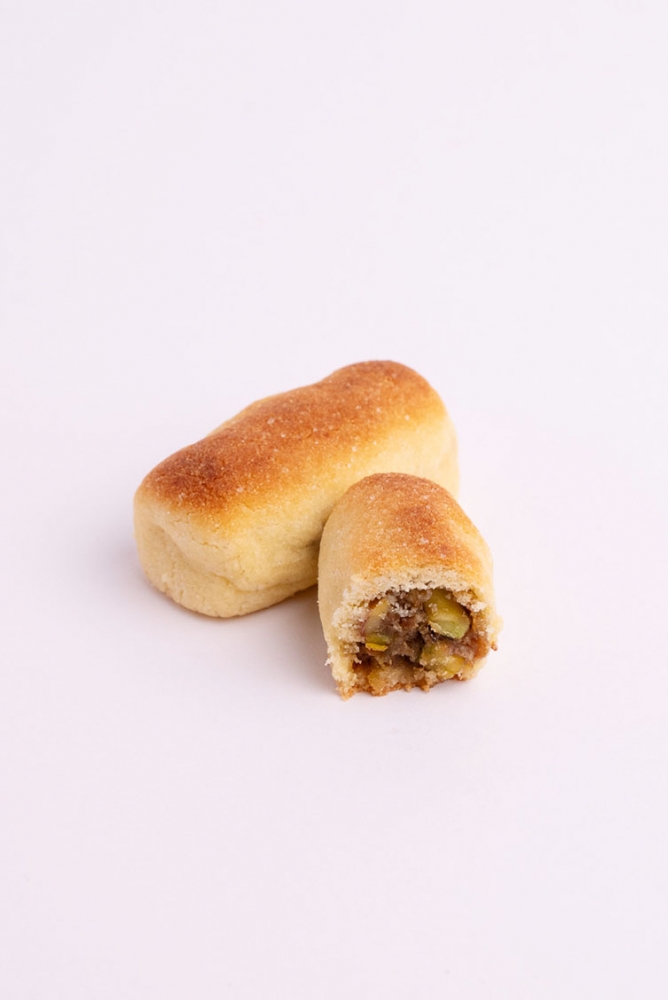 12 pcs of Karabij Pistachios Fingers. Ingredients: Pistachio, semolina, sugar, animal ghee, cashew, sugar syrup, wheat flour, egg, vegetable oil, water, milk, starch, rose water, yeast, salt, dough improver, soy flour, antioxidant (E321), preservative (E202), emulsifier (saponaria roots, E334) vanilla